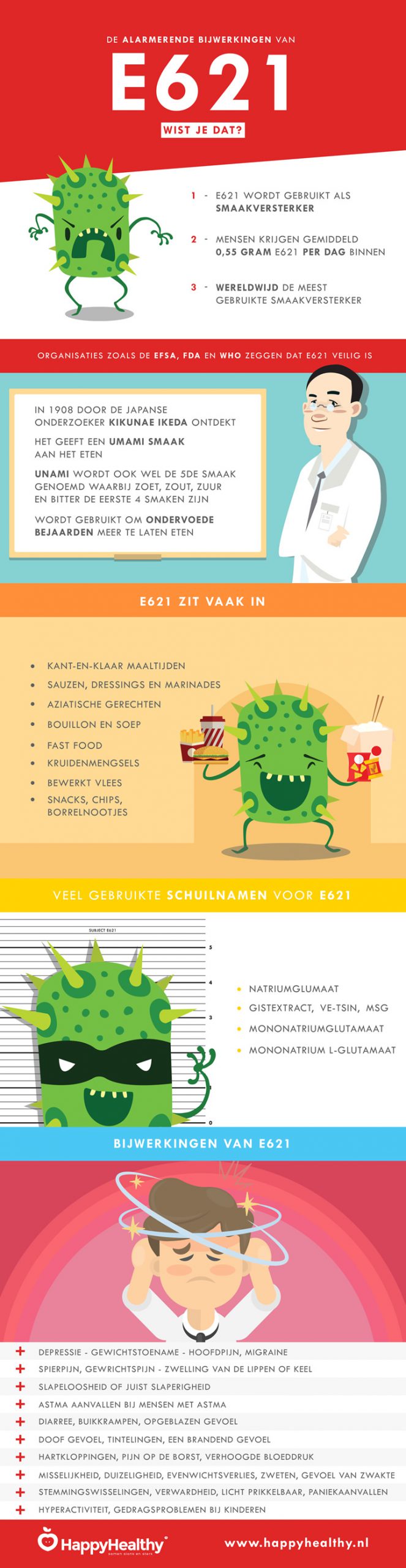 Ik herken jouw verhaal Conny. Bij mij ook na het eten van Chinees eten. Ik werd anderhalf uur later echt ziek. Mijn hart klopte als een bezetene en ik voelde me echt erg naar. Ik ben ook in het ziekenhuis beland op de eerste harthulp. Daar bleek na een tijd dat mijn hartritmestoornis niet over ging. Hier hebben ze, gelukkig met behulp van een infuus, mijn hartritme weer kunnen herstellen. In het ziekenhuis wisten ze wel te vertellen dat dit vaker voor kwam na het eten van een Chinese maaltijd. Voor mij geen Chinees meer en ook ik let op bij het boodschappen doen. Ik probeer E621 zo veel mogelijk te mijden (hoewel ik wel denk dat het bij Chinees eten in veel grotere hoeveelheden wordt gebruikt).