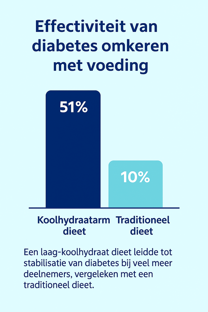"De resultaten toonden aan dat 97% van de diabetes type 2-patiënten die een koolhydraatarm dieet volgden, verbetering zagen in hun bloedsuikerwaarden, en 51% bereikte zelfs remissie (normale bloedsuikerspiegel zonder medicatie). Met name bij mensen die nog geen jaar diabetes hadden, haalde 77% remissie."